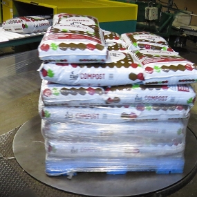 4.5m3 bales of compressed peat, wrapped and on a pallet for easy distribution.